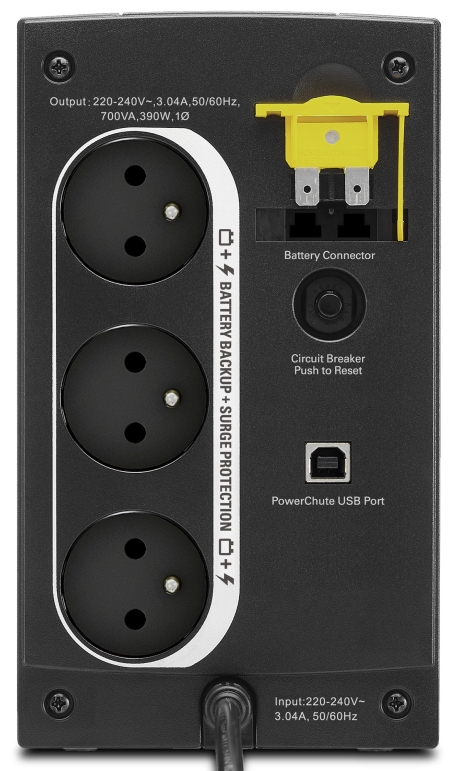 Pokiaľ potrebujete okrem ochrany voči vysokej rázovej energii aj elektrickú zálohu zariadení, potom je tu pre vás UPS APC BX700U-FR. Výstupná kapacita je 700 VA alebo 390 W, postačí teda na prevádzku asi viacerých počítačov a monitorov aj v prípade výpadku elektrického napájania. Elektrická energia sa pri prechode cez túto UPS filtruje a zmeny napätia sa vyrovnávajú. Konkrétne sa posilňuje nízke napätie až o 41 % a vysoké sa obmedzuje až o 15 %.