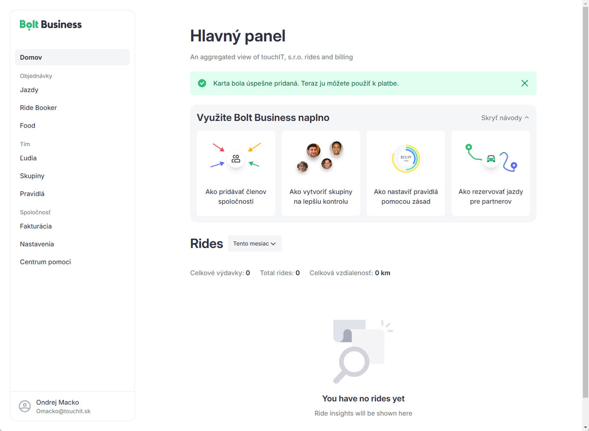 Práve tento scenár je dôvodom, prečo čoraz viac firiem prechádza na digitálne platformy. Príkladom je Bolt Business. Tieto platformy umožňujú nielen zjednodušenie procesov, ale aj výraznú úsporu nákladov na cestovanie. Platforma integruje všetky firemné jazdy do jedného systému, čím výrazne šetrí čas, zjednodušuje správu cestovných výdavkov a prináša jasný prehľad o nákladoch.