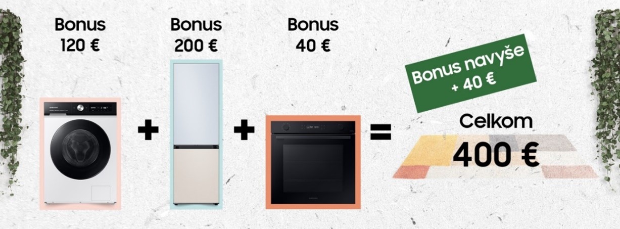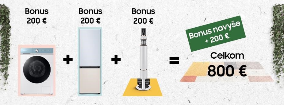 Bonus na jednotlivé produkty je od 40 do 200 eur. Ak si teda zakúpite Bespoke práčku s bonusom 200 eur, Bespoke chladničku s rovnakým bonusom 200 eur a tyčový vysávač Bespoke Jet Pet s bonusom 200 eur, dostanete ďalší Bespoke bonus navyše za kúpu troch produktov vo výške najnižšieho bonusu, čo je v tomto prípade 200 eur, a celkovo tak za nákup ušetríte 800 eur.