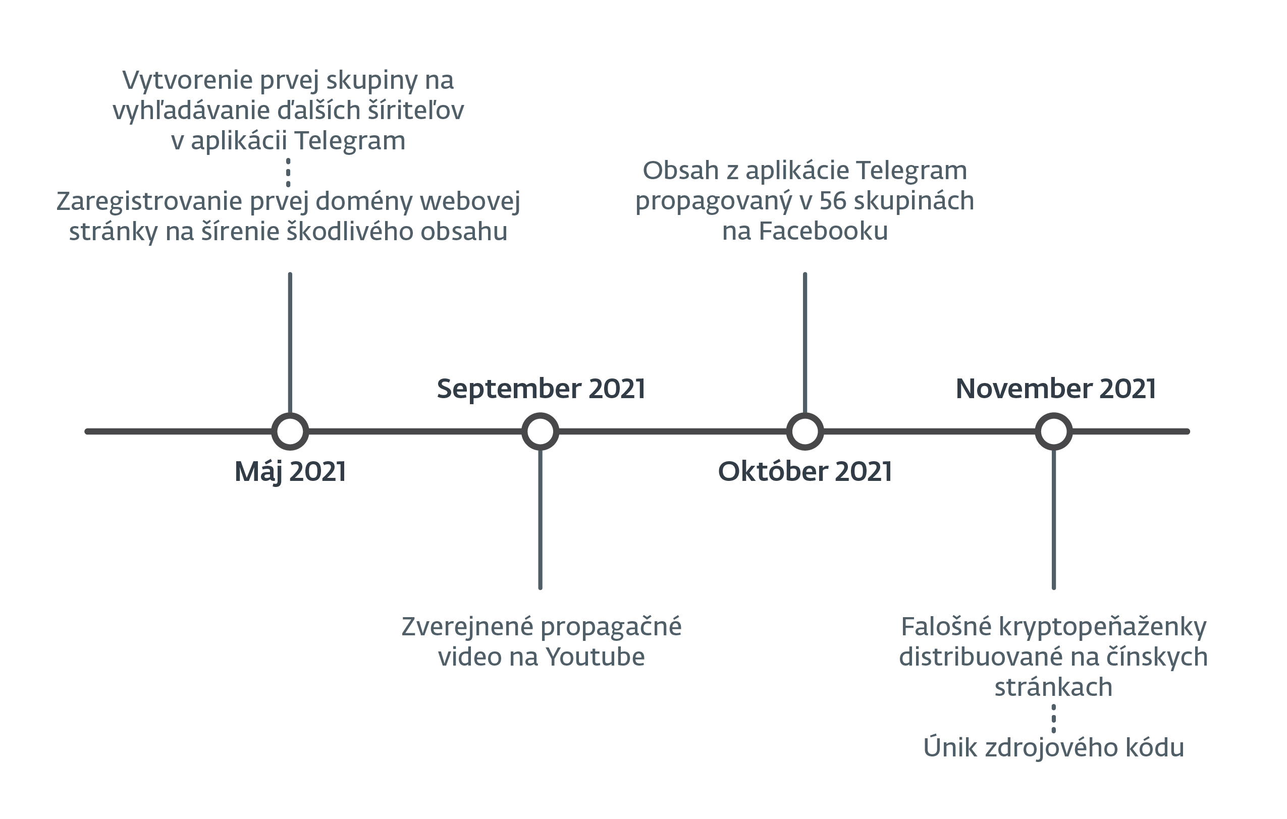 Na bezplatnej a obľúbenej multiplatformovej četovacej aplikácií Telegram, ktorá obsahuje funkcie na posilnené zabezpečenie súkromia, našiel ESET desiatky skupín propagujúcich škodlivé kópie krypto peňaženiek. Výskumníci predpokladajú, že tieto skupiny boli vytvorené autormi podvodnej schémy za účelom vyhľadávania ďalších šíriteľov. Táto aktivita prebieha už od mája 2021. Od októbra 2021 zaznamenal ESET šírenie a propagovanie skupín z Telegramu najmenej v 56 skupinách na Facebooku s tým istým cieľom vyhľadávania nových distribútorov škodlivého obsahu. V novembri 2021 bezpečnostní experti zaznamenali šírenie škodlivých aplikácií prostredníctvom dvoch legitímnych čínskych webových stránok.