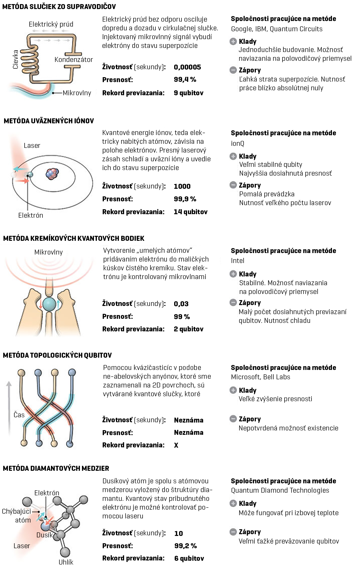 Je veľmi zaujímavé, že Microsoft sa vydal celkom inou cestou a pri univerzálnom kvantovom počítači vsádza na zatiaľ nepotvrdený, ale nádejný topologický koncept. Jeho hlavnou výhodou je veľká ochrana qubitov vychádzajúca z topologického usporiadania, ktorá by mala zaručiť lepšiu funkčnosť a otvorila by dvere k stavbe pokročilých univerzálnych kvantových strojov, ktoré by dokázali vykonávať kvantové operácie v dlhšom čase. K slovu sa párkrát dostal aj Intel, ktorý síce vlastné laboratórium pre vývoj počítačov tohto typu nemá, ale v priebehu posledných rokov investoval do univerzitného výskumu v oblasti qubitov v podobe kvantových bodiek. Pri tejto metóde qubit reprezentuje malá čiastočka kremíka, ktorá je osadená do obvodu a jej kvantový stav je ovládaný mikrovlnami. Táto metóda je občas nazývaná aj ako metóda „umelých atómov“, pričom Intelu sa páči najmä preto, že je veľmi príbuzná s aktuálnym svetom polovodičov. V súčasnosti je táto metóda pomerne málo vyspelá, pričom rekordom je zatiaľ vytvorenie dvoch qubitov, ktoré vydržali v superpozícii 30 mikrosekúnd, čo sa podarilo na univerzite v austrálskom Sydney. V infografike môžete vidieť, ako sú na tom ostatné metódy.