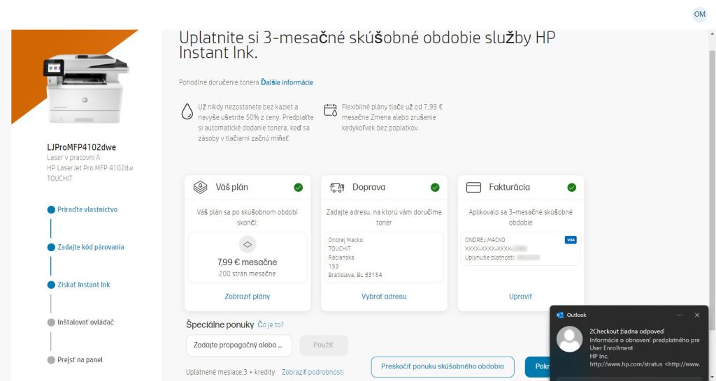 Zariadenie vtedy zobrazí párovací kód, ktorý je platný na 2 hodiny. Počas tejto doby sa presuniete k počítaču a začnete konfiguráciu tu. Aktivácia služby HP+ znamená priradiť vlastníctvo zariadenia, zadanie kódu párovania, môžete získať službu Instant Ink ako bezproblémové doručenie toneru s úsporou peňazí a na záver je to inštalácia najnovšieho ovládača zariadenia priamo z internetu.