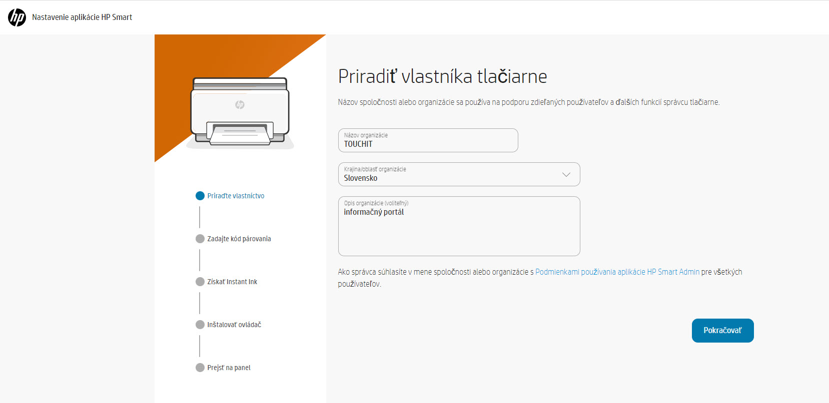 V našom prípade sme tak zadali názov organizácie a ďalšie voľby a do vytvoreného okna v počítači zadali párovací kód zobrazený na zariadení. Pre lepšiu správu zariadenia ďalej pomenujete a popíšete jeho umiestnenie. Potom prebieha aktivácia služby HP+.