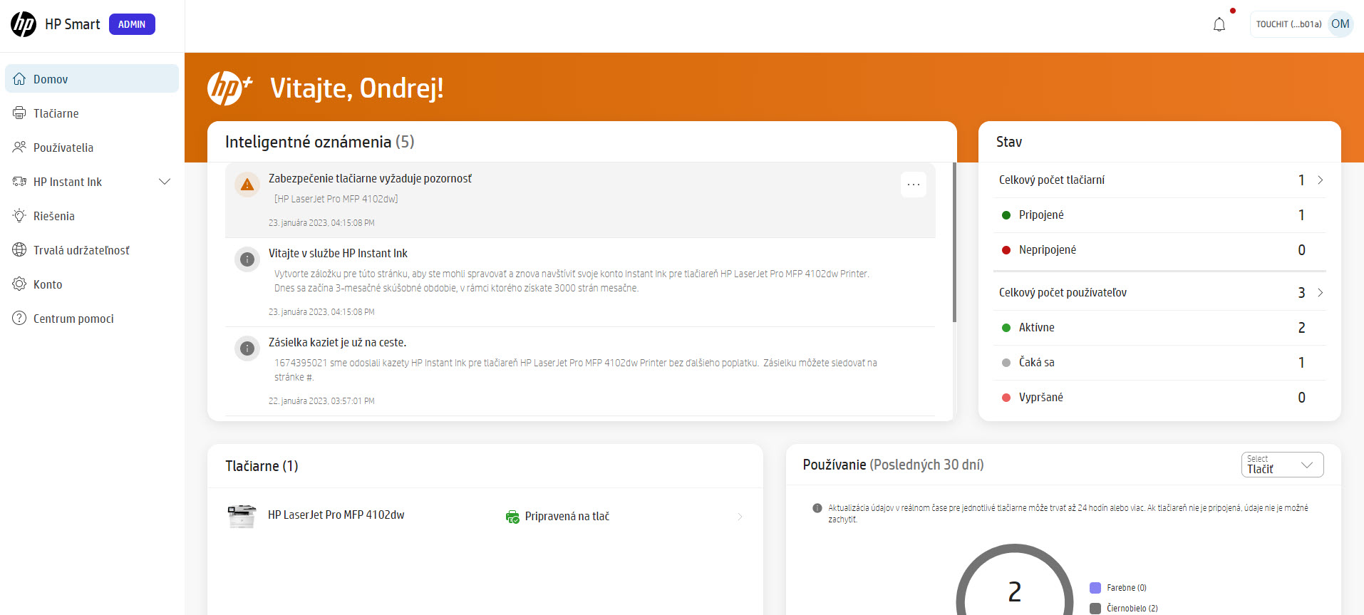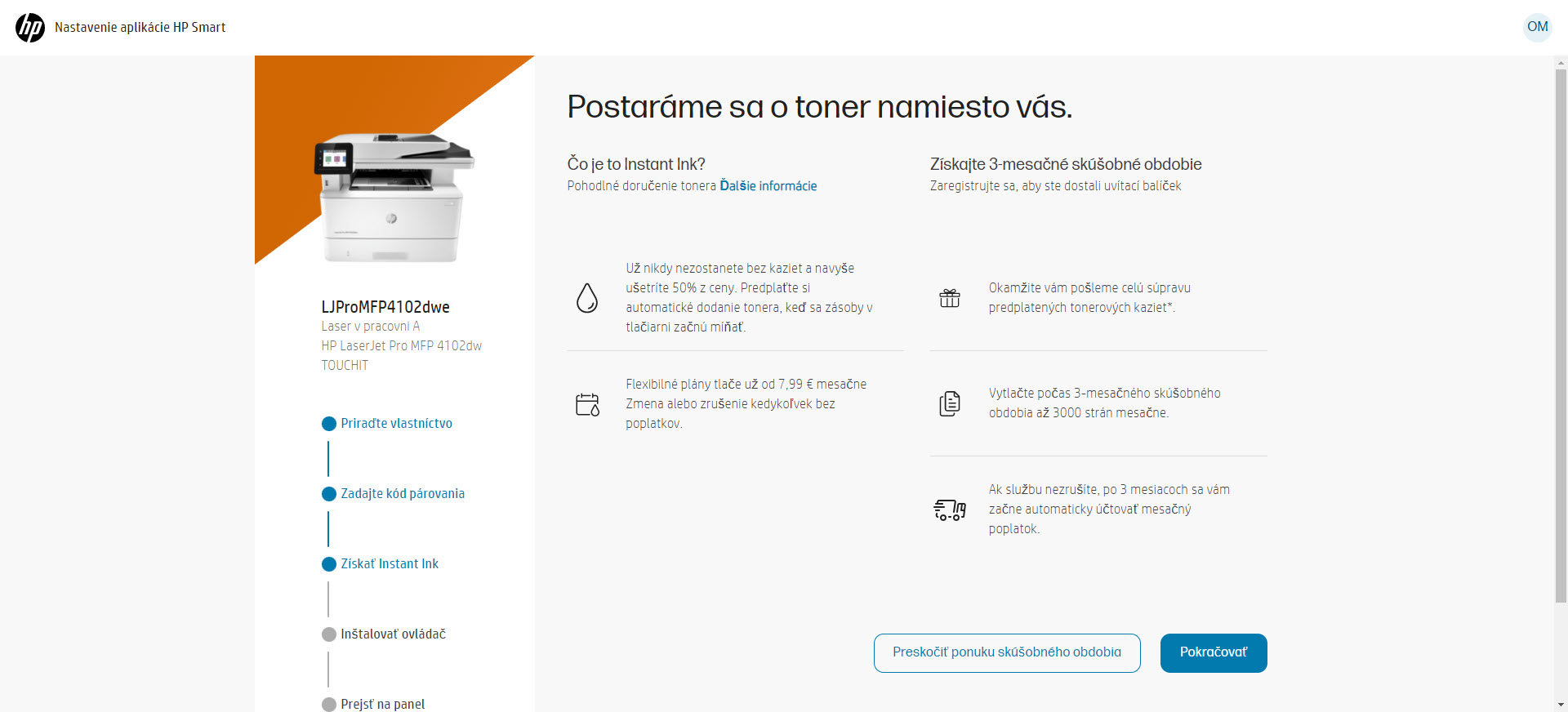 Zariadenie vtedy zobrazí párovací kód, ktorý je platný na 2 hodiny. Počas tejto doby sa presuniete k počítaču a začnete konfiguráciu tu. Aktivácia služby HP+ znamená priradiť vlastníctvo zariadenia, zadanie kódu párovania, môžete získať službu Instant Ink ako bezproblémové doručenie toneru s úsporou peňazí a na záver je to inštalácia najnovšieho ovládača zariadenia priamo z internetu.