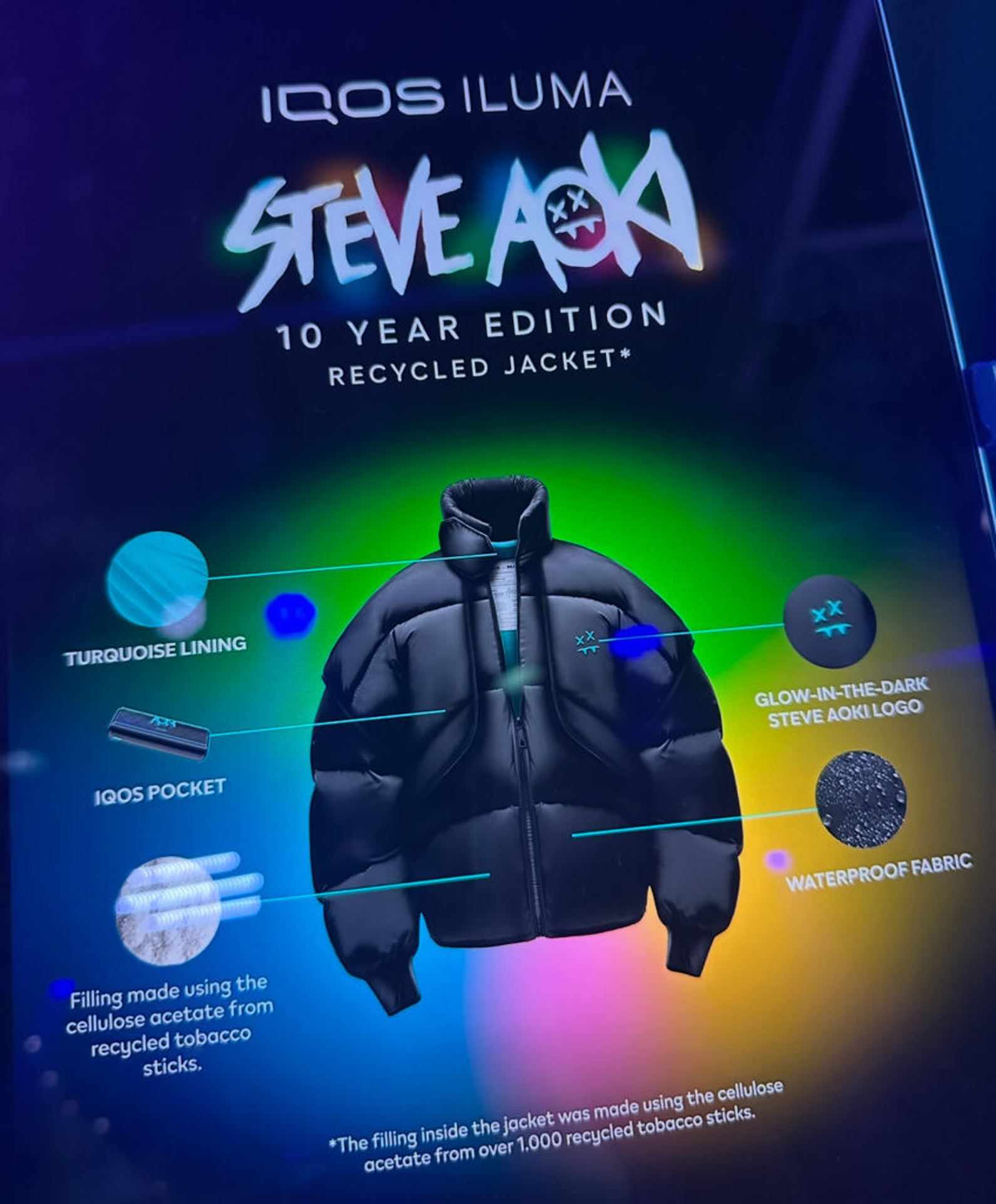 Na hrudi je ikonické logo Steva Aokiho svietiace v tme a nechýba ani vrecko navrhnuté špeciálne na zariadenie IQOS. Vyrobených bolo len 1000 kusov pre celý svet a dospelí užívatelia IQOS majú možnosť túto bundu vyhrať. Stačí napr. do predajne IQOS priniesť vrecko s použitými tabakovými náplňami, zapojiť sa do hry v IQOS clube alebo sledovať sociálne siete pre možnosť vyhrať aj ďalšie novinky od Steva Aokiho. Bundu nie je možné kúpiť, dá sa len vyhrať.