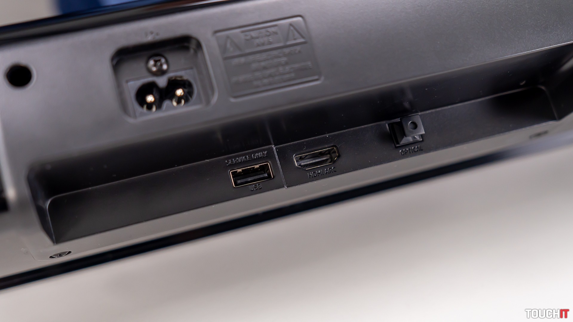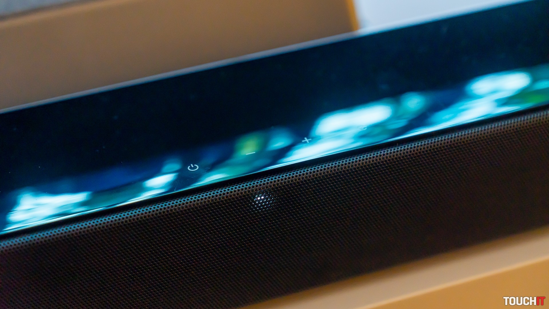 O prevádzkovom stave informuje malá LED, ktorá neruší pri bežnej prevádzke. V hornej časti sú skryté ovládacie tlačidlá, ktorými prepájate zdroj zvuku a nastavujete hlasitosť. Ak tento soundbar máte pripojený k modernému televízoru cez HDMI, automaticky sa s televízorom zapne a vypne.