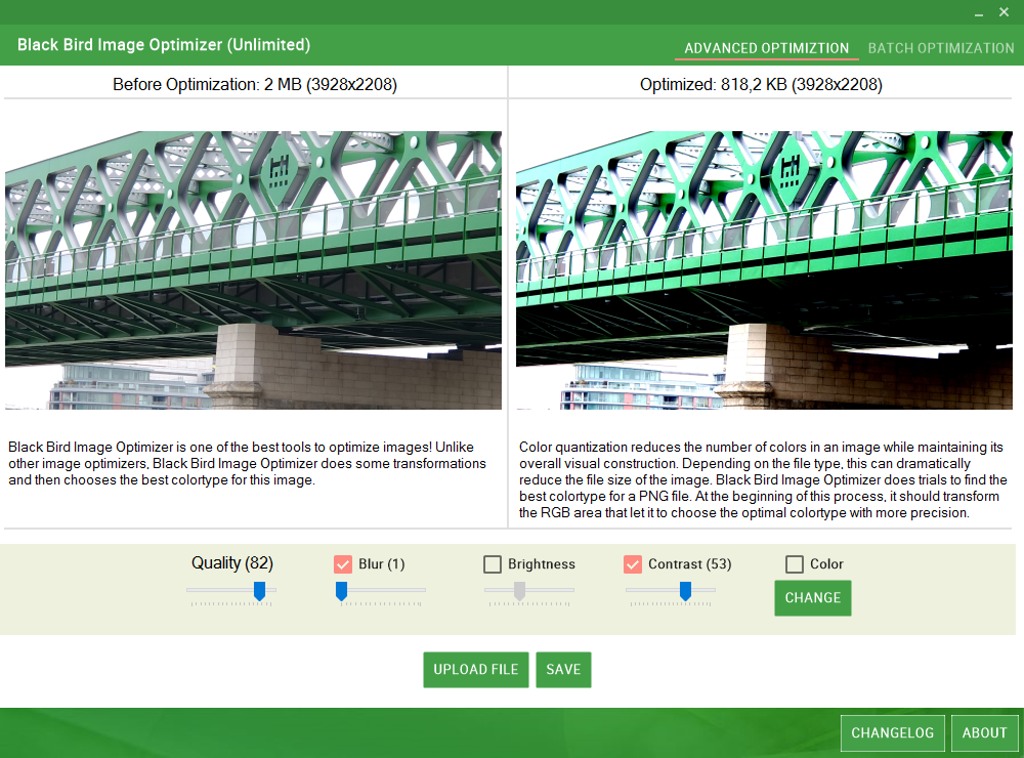 Obrázky sa dajú rozostrovať, takisto po jemných krokoch, upravovať im jas a kontrast. Program má špeciálny algoritmus, ktorý upravuje obrázky bez straty ich vizuálnej kvality a najmä farebnosti. Dosahuje to znižovaním počtu farieb, ktoré obrázok obsahuje. Vďaka tomu je vo výsledku menší, ale voľným okom tieto rozdiely nie sú poznať.