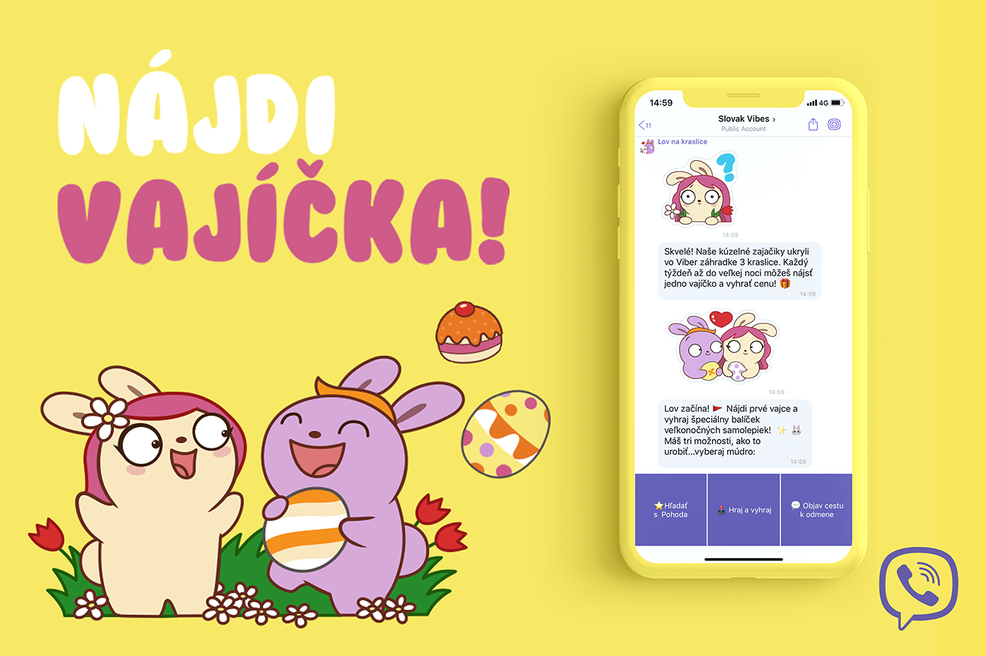Naši veľkonoční zajačikovia ukryli v hre 3 vajíčka, ktoré je potrebné objaviť do Veľkej noci. Akonáhle jedno z nich objavíte, získate špeciálny kód na stiahnutie inak platenej sady veľkonočných samolepiek. Vajíčka sa budú hľadať až do Veľkej noci. Keď užívateľ vajíčko nájde, vyhrá promo kód, pomocou ktorého môže odomknúť jeden z 3 balíčkov nálepiek, ako svoju veľkonočnú odmenu. Po spustení interakcie s chatbotom si užívatelia môžu vybrať jednu z troch ciest k výhre. Do prvej možnosti je na Slovensku zapojený aj obľúbený Pohoda festival a cvicte.sk. Pohoda ukrýva vajíčko medzi obsahom vlastnej Viber Comunity s názvom Pohoda Festival Official a cvicte.sk vo svojej komunite The Supershape. Keď bot presmeruje hráča do komunity, opýta sa, ako vyzerá vajíčko, ktoré našiel. Vajíčko partnera je tiež ukryté v zábavnej hre, ktorú môžu používatelia začať hrať kliknutím na tlačidlo PLAY. Druhou možnosťou je hrať zábavnú hru, v ktorej prefíkané zajačiky ukryli vajce niekde v poli medzi oranžovými mrkvičkami. Máte nekonečné množstvo pokusov, až kým hľadané vajíčko neobjavíte. A na záver pre tých, ktorých bojové pole s mrkbvou neláka, ponúka Viber záchrannú možnosť. Hacking hry tým, že pozvete troch priateľov, aby sa pripojili. Odmena bude automaticky odomknutá tým, ktorí pošlú pozvánky svojim kamarátom. „Veríme, že náš nápad a jeho digitálne spracovanie poteší našich užívateľov a sprostredkuje im zábavu. A to je to, o čo nám ve Viber ide, šířit dobrú náladu“ povedala Zarena Kancheva, marketing a PR riaditeľka Rakuten Viber pre oblasť strednej a východnej Európy. Tohtoročný veľkonočný Viber prináša zábavný obsah a možnosti, ako vylepšiť vaše konverzácie o skvelé samolepky. Stiahnite si veľkonočné samolepky a užite si Veľkú noc!