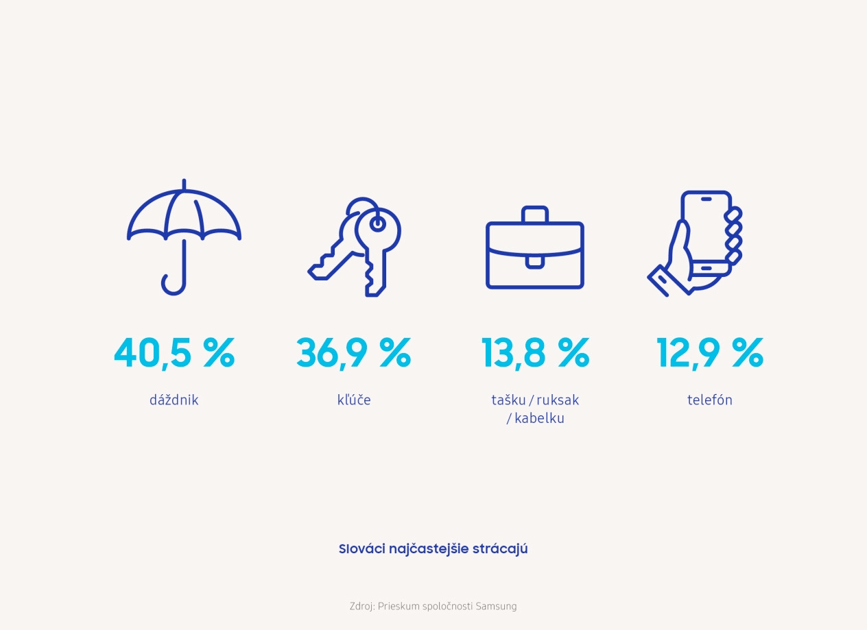 Slováci najčastejšie strácajú dáždnik (40,5 %). Na druhom mieste sa umiestnili kľúče (36,9 %) a veci, ako sú taška, ruksak či kabelka (13,8 %) nasledované mobilným telefónom (12,9 %) a peňaženkou (10,3 %). Slováci často strácajú tiež rôzne kusy oblečenia, okuliare, peniaze, USB kľúče alebo slúchadlá, ale napríklad aj dôležité dokumenty. „Strata týchto predmetov znamená nielen finančnú ujmu, ale veľakrát aj časovú, obzvlášť ak ide o stratu peňaženky s dokladmi,“ komentuje prieskum Tomáš Balík, riaditeľ mobilnej divízie českého a slovenského Samsungu. „V niektorých prípadoch ľudí netrápi ani čas či peniaze, ale emocionálna väzba ku stratenému objektu, ako v prípade stratených domácich miláčikov.“