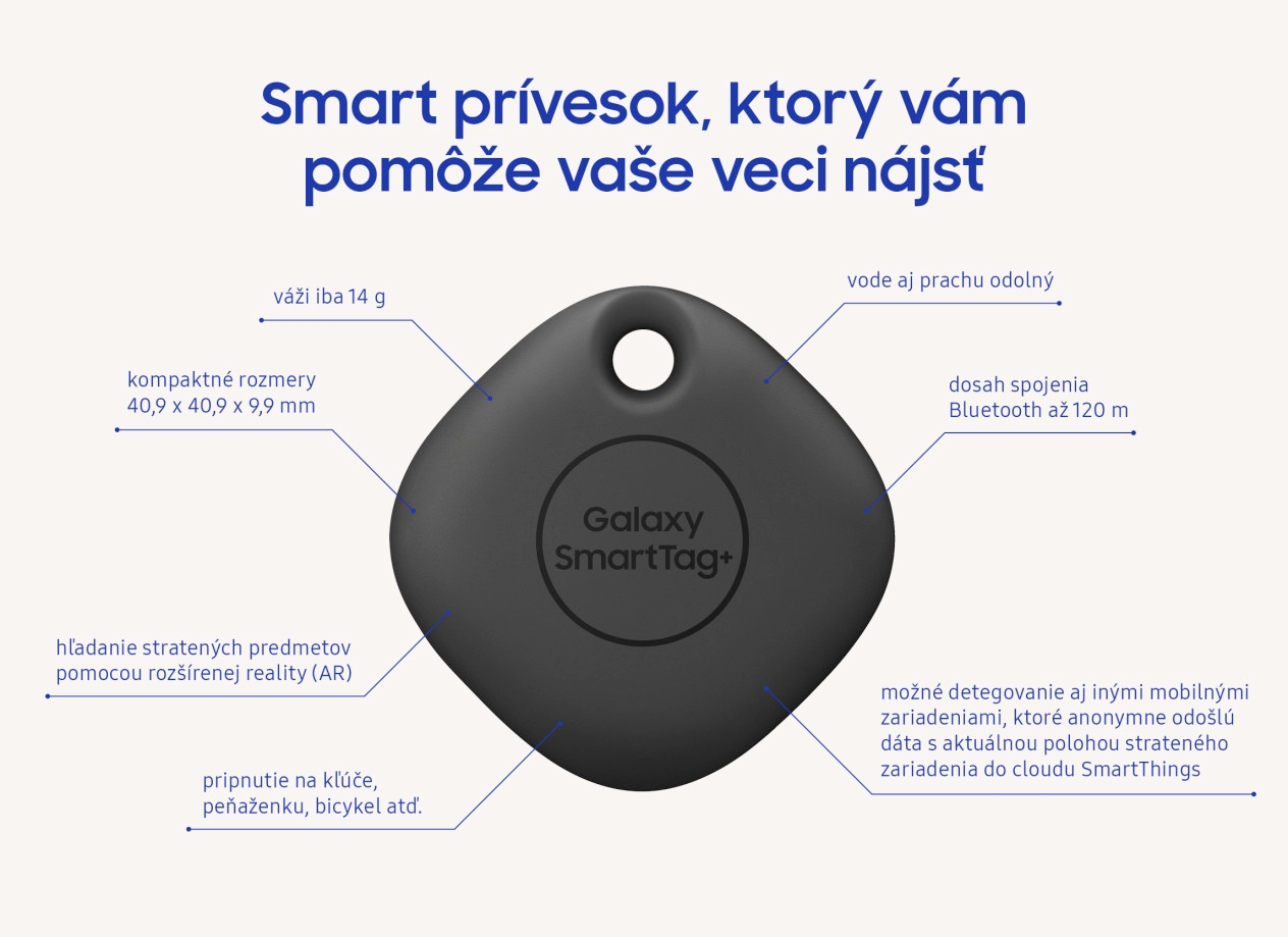 Inteligentné prívesky Galaxy SmartTag a Galaxy SmartTag+ od Samsungu pomôžu vaše veci nájsť. Majú kompaktné rozmery 40,9 x 40,9 x 9,9 mm a vážia len 14 g (39 x 39 x 9,8 mm a 13 g v prípade SmartTag). Je teda jednoduché pripnúť ich na veci rôznych veľkostí od kľúčov cez peňaženku až po kabelku či bicykel. Galaxy SmartTag+ je navyše vybavený technológiou UWB (ultra-wideband), ktorá umožní presnejšiu lokalizáciu a tiež využíva technológiu rozšírenej reality (AR)[1]. Funkcia AR Finder privedie užívateľa k hľadanému predmetu pomocou fotoaparátu a systému rozšírenej reality na displeji smartfónu[2]. Oba prívesky majú reproduktor a stratený predmet môžete hľadať aj pomocou zvuku.