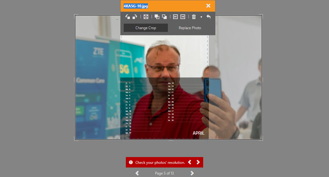 Teraz dolaďte presnú polohu obrázka. Dvojklikom otvorte vybranú stránku v kalendári, kliknite na fotografiu a môžete ju otočiť resp. upraviť veľkosť. Nezabudnite, že v hornej časti stránky kalendára by nemalo byť nič dôležité. Väzba kalendára totiž bude práve na týchto miestach.