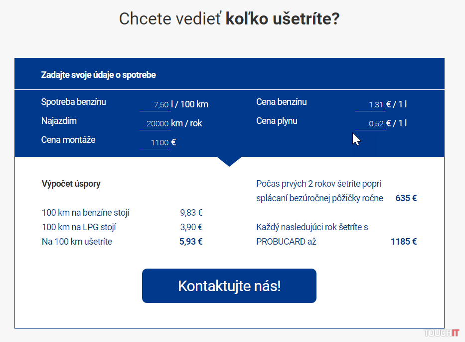 To je dôležitý bod, lebo prestavba niečo stojí a treba to zohľadniť pri celkovom šetrení. Cena prestavby je tak 1100 Eur a to nie je málo. Na prestavbu však dostanete v Probucard pôžičku. Túto pôžičku budete splácať z už ušetrených peňazí, teda postupne ako jazdíte. Je jasné, že čím viac jazdíte, tým skôr sa dostanete do stavu nula a začnete „zarábať“ – lepšie povedané platiť menej, ako by ste mali v prípade čisto benzínového pohonu. Ako presne? Na to je na stránke Probucard pekná Kalkulačka úspory, kde zadávate svoje parametre a zistíte, koľko ušetríte.
