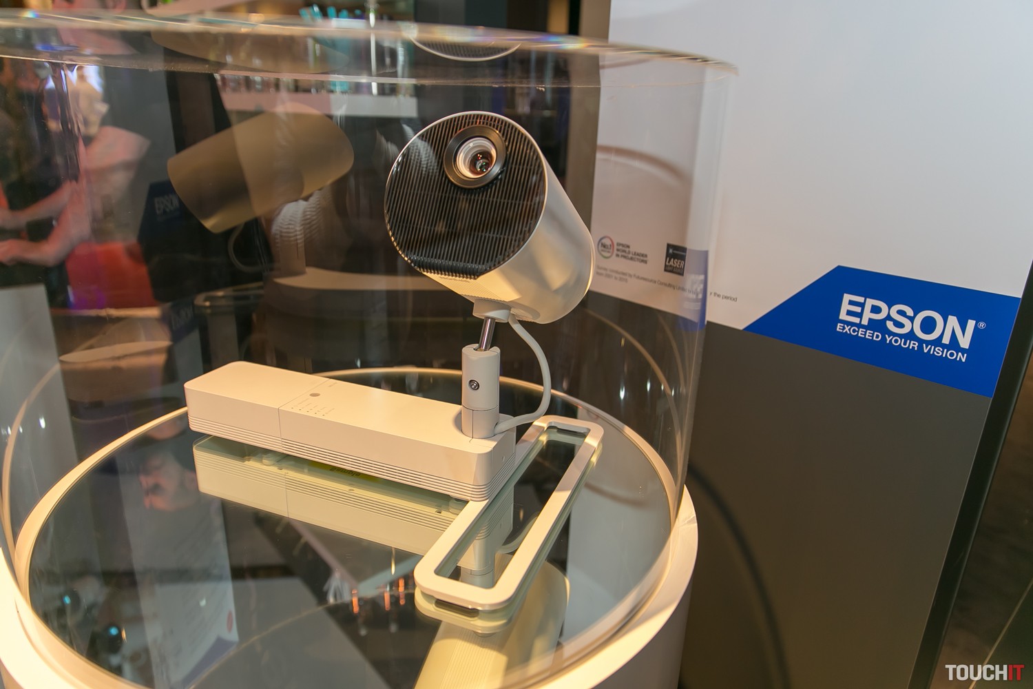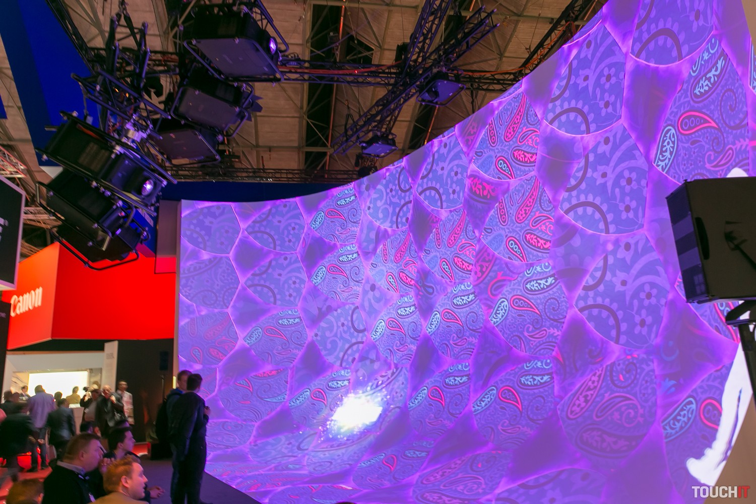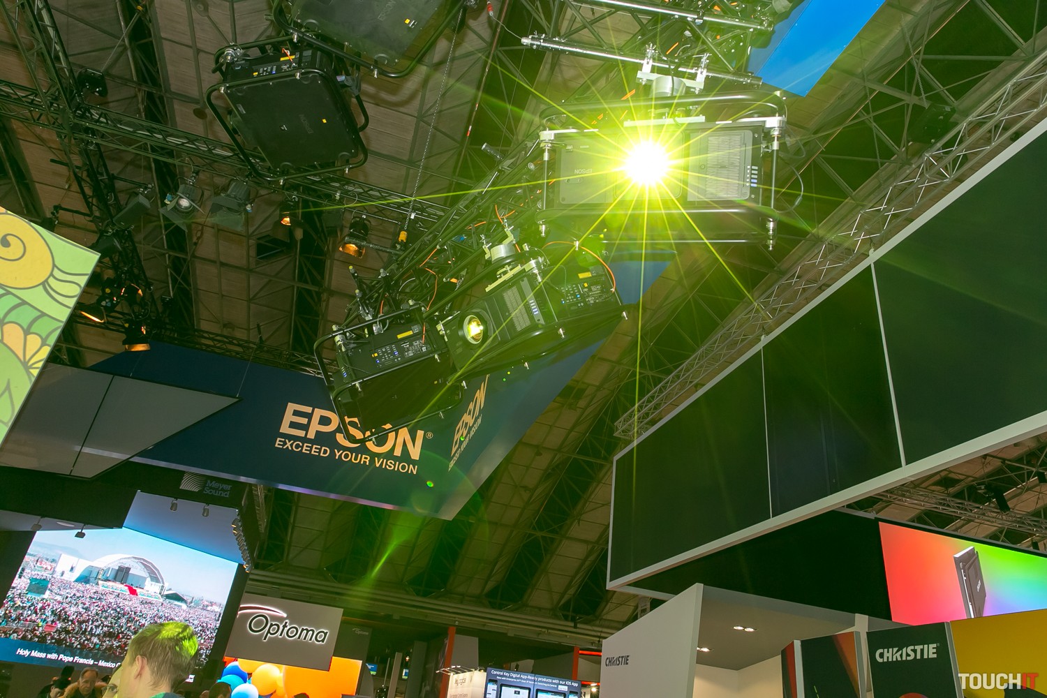 Na výstave ISE sme boli aj na stánku firmy Epson. Jej prezentácia bola mohutná, na vstupe bola šestica laserových projektorov, ktoré vytvárali dynamickú plochu s pohybujúcimi sa objektmi na zakrivenej ploche – tzv. 3D mapping.