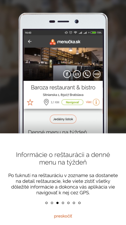 Úvodná stránka aplikácie zobrazuje iba nevyhnutné informácie o aktuálnom dennom menu. Reštauráciu si môžete pridať medzi obľúbené alebo po ťuknutí na jej názov získať ďalšie informácie, ako je odkaz na webové stránky, telefóne číslo či funkcia navigácie cez Google Mapy. Praktické. Menucka.sk obsahuje iba informácie o obedových menu, čo je vzhľadom na koncept aplikácie pochopiteľné. Kompletný jedálny lístok však nájdete napr. na webových stránkach, na ktoré aplikácie odkazuje.