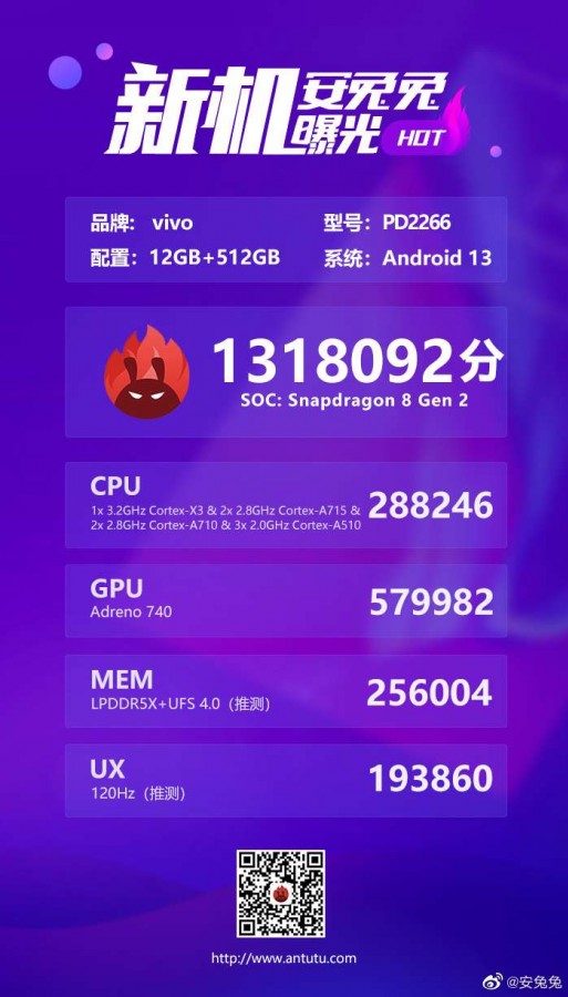 Porovnávacia platforma AnTuTu však okrem čipovej sady prezradila aj ďalšie kľúčové parametre a detaily. Zariadenie v štýle modelu Samsung Galaxy Z Fold4 má kódové označenie PD2266. Okrem spomínaného vlajkového čipsetu spoločnosti Qualcomm zariadenie dostane až 12 GB RAM LPDDR5X. Testované zariadenie malo aj 512 GB úložisko UFS 4.0 a 120 Hz displej.