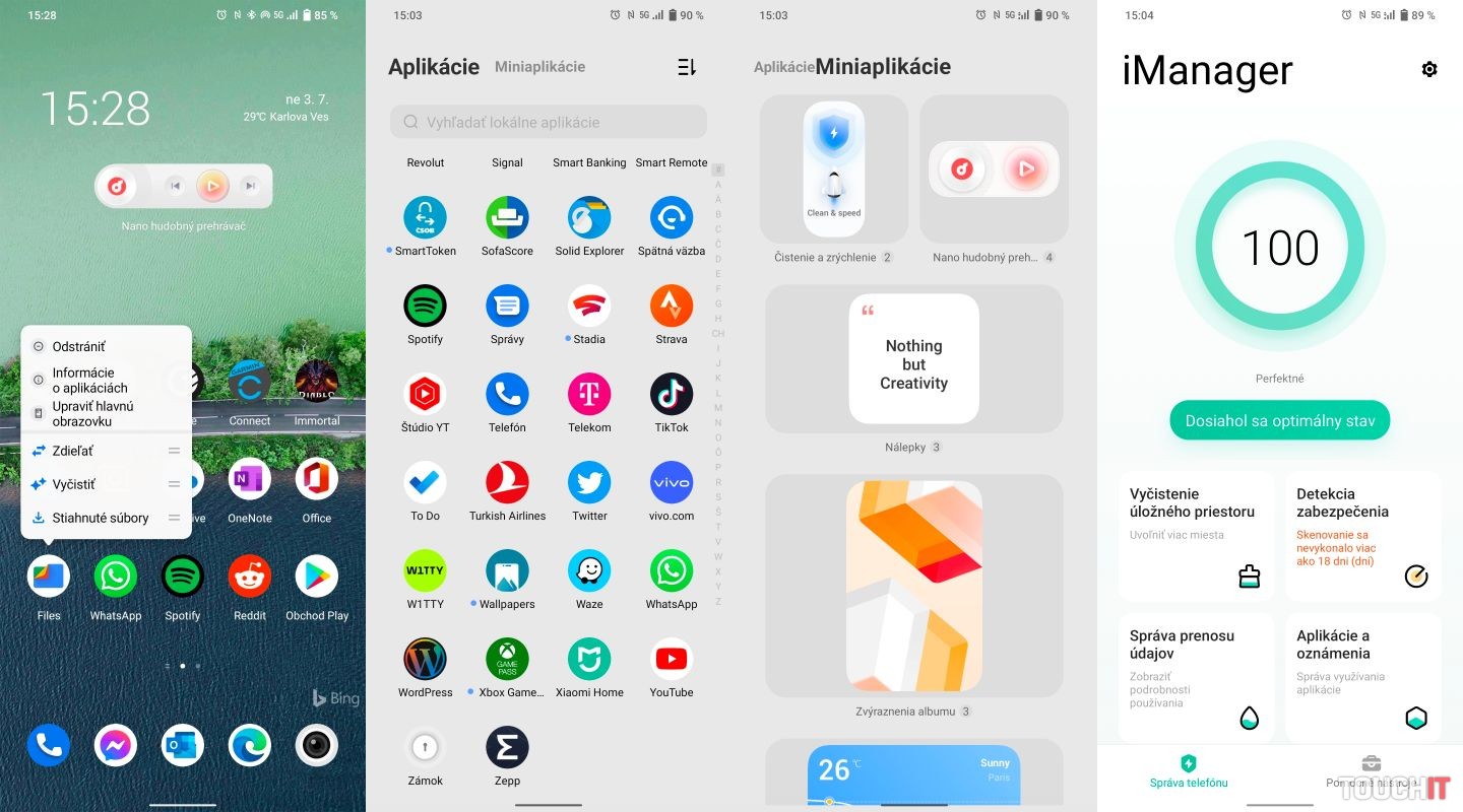 Poteší, že v telefóne nájdete minimum predinštalovaného balastu. Navyše je prakticky iba aplikácia vivo.com a iManager na správu a optimalizáciu telefónu. Súčasťou výbavy je tiež prehliadač fotiek a prehrávač hudby od Vivo, avšak aplikácie ako Telefón, Kalendár, Správca súborov – to všetko sú nástroje priamo od Googlu.