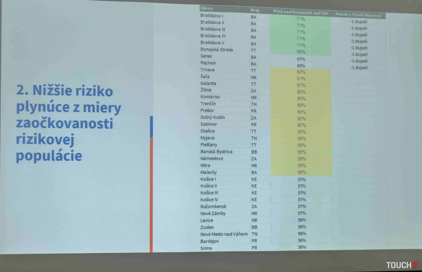 Ak je v niektorom okrese zaočkovanosť ľudí nad 50 rokov vyššia ako 55 %, okres bude odmenený. Za každých 10 % nad tento limit sa okres posunie na Covid mape o jeden stupeň smerom k lepším okresom. Konkrétne teda ak má okres zaočkovanosť nad 67 % pre ľudí nad 50 rokov, posunie sa o 1 stupeň k zelenej farbe. Toto je výhodné pre najlepšie okresy na Slovensku ako je Bratislava alebo Dunajská Streda, ktoré sa nikdy podľa tejto stratégie nemôžu stať čiernym okresom.