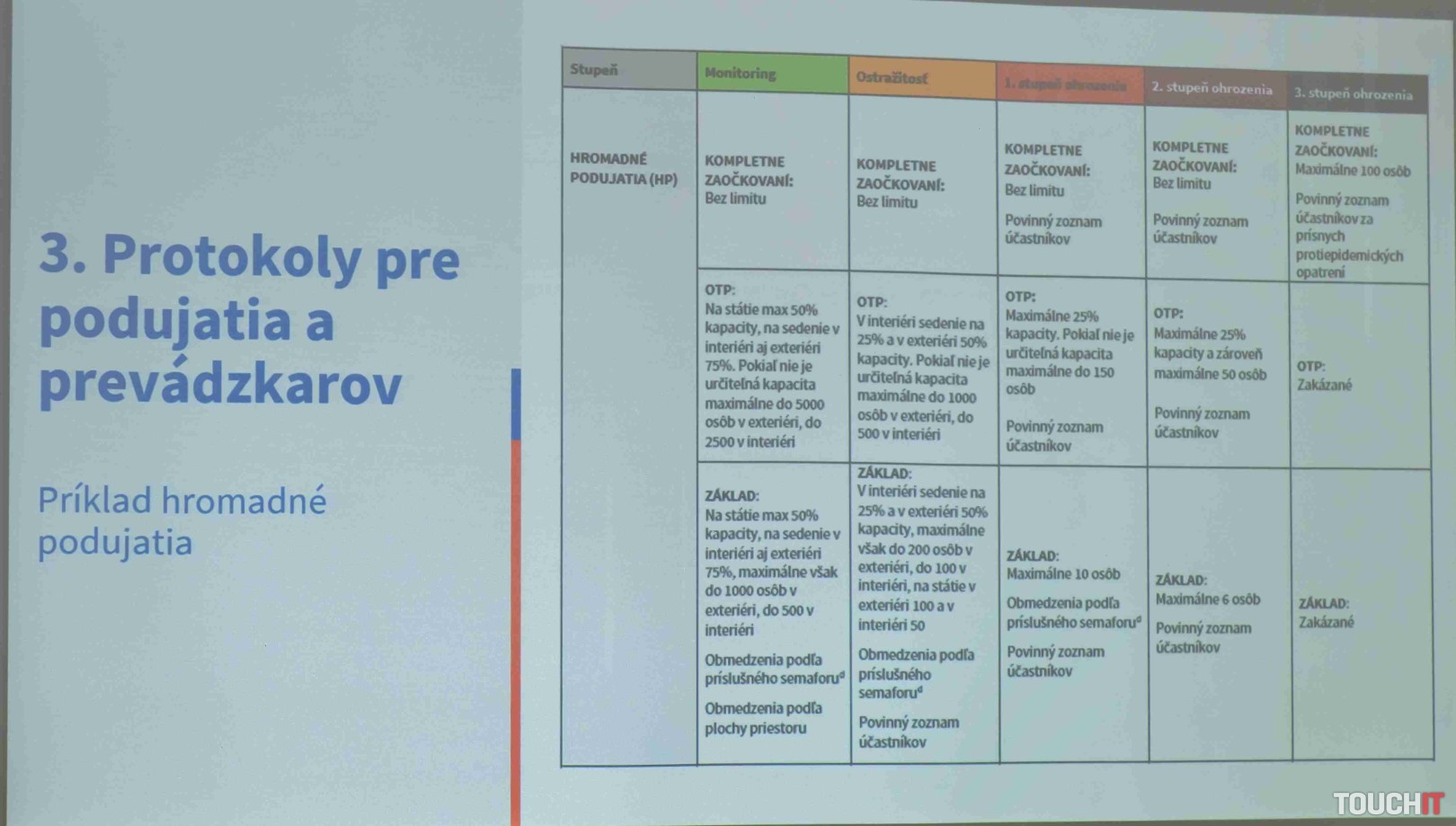 Protokoly sú tri: 1 – prístup len pre kompletne zaočkovaných ľudí, 2. – OTP (očkovaní, testovaní, prekonaná choroba), 3. bez špeciálnej kontroly. Ako sme sa dozvedeli, jednotlivé protokoly sa môžu počas dňa aj meniť. Prevádzkovateľ však musí zaistiť, aby určite nedošlo k zmiešaniu skupín. Podľa doterajších predstáv by mali byť jednotlivé prevádzky informovať o tom, aký protokol majú práve zavedený a to napr. vývesnou tabuľkou.