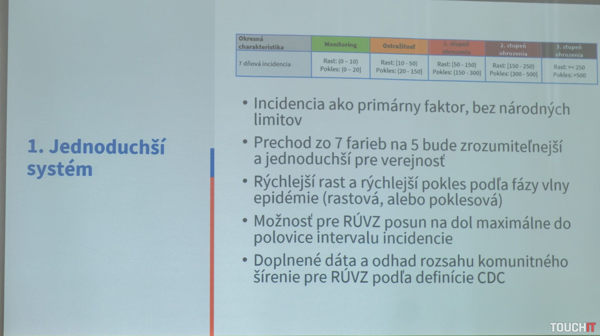 Na COVID mape Slovenska sa zníži počet kategórií, ktoré môžu mať jednotlivé okresy. Z pôvodných 7 bude teraz 5 pásiem. Zároveň sa zavedie pojem rastová a poklesová fáza. Ak teda začína narastať počet infikovaných ľudí v danom okrese, je to rastová fáza a vtedy treba zaviesť prísne opatrenia veľmi rýchlo ale s tým, že je tu vidina skorého uvoľnenia opatrení. V takomto prípade podľa doterajšej praxe sú opatrenia veľmi účinné a výsledok je skorý pokles nakazených. Poklesová fáza potom môže byť opäť veľmi rýchla. Oveľa rýchlejšia, ako sme male doteraz.