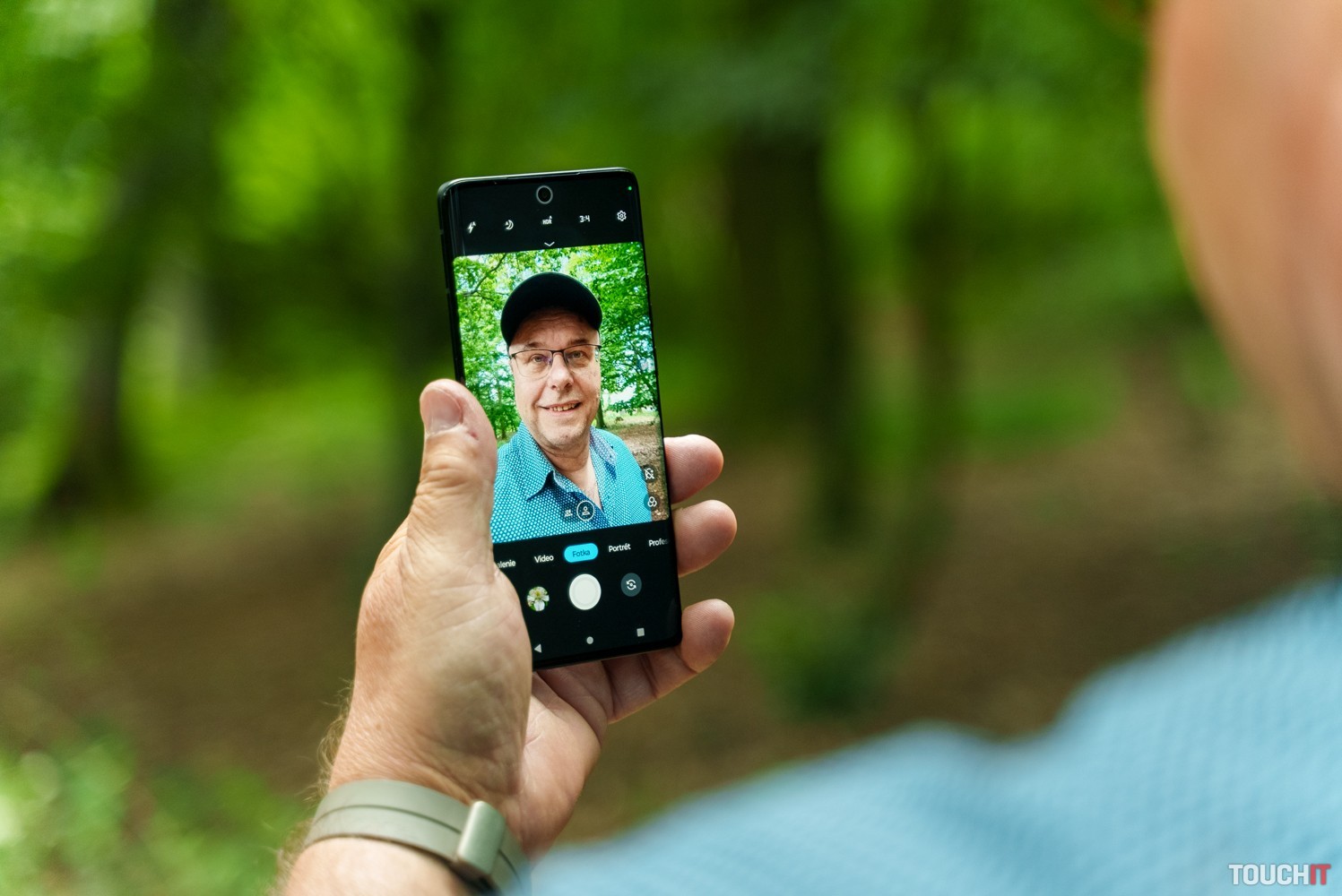 Potvrdzujeme, že telefón sa ľahko drží v jednej ruke, doslova padne do ruky. Na test sme mali čiernu verziu, ktorá je vybavená tzv. vegánskou kožou. V skutočnosti je to umelá koža, ktorá ďalej podčiarkuje možnosť stabilného úchopu telefónu v ruke. Je to veľmi príjemné na dotyk. V tejto koži sú efektne vyrazené hlavné parametre hlavného fotoaparátu. Pod displejom je optický snímač odtlačku prsta a funguje veľmi rýchlo.
