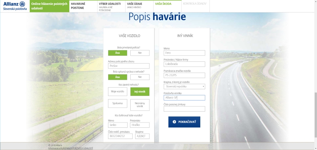Tieto údaje určite viete a udávajte aj skutočné číslo telefónu, kde vám bude možné zastihnúť počas bežnej pracovnej doby. Nasleduje otázka o tom, aké vozidlo bolo poškodené. Asi nikto si nepamätá číslo poistnej zmluvy, ale doma v pokoji si ho môžete vyhľadáť. Nemusíte to však robiť, postačuje ŠPZ vozidla a rodné číslo majiteľa alebo IČO firmy, na ktorú je automobil registrovaný. Tieto údaje asi viete zistiť aj v teréne a tak môžete pokojne pokračovať. Zadáte dátum a miesto vzniku škody.