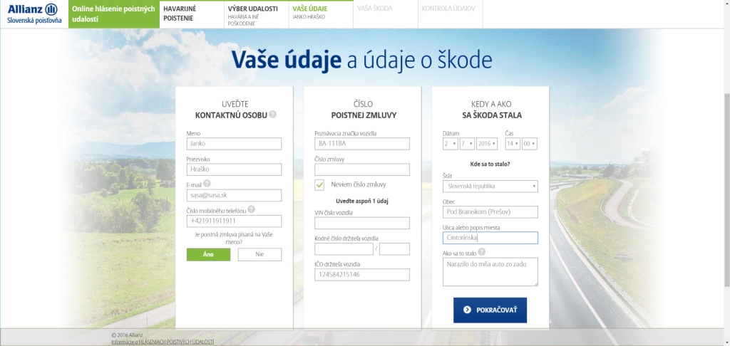 Vyberieme si napr. haváriu, čo je asi najčastejší prípad. Vypĺňate údaje o kontaktnej osobe – tradičné veci ako je meno, mail, telefón. Zadaním mailu súhlasíte s ďalšou komunikáciou s dokladmi formou mailu, čo vám určite odporúčame. Zadajte mail, ktorý si pozeráte každý deň.