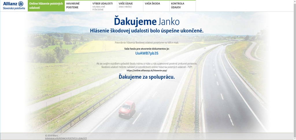 Tým ste s hlásením skončili, v záverečnom zhrnutí si ešte pozriete všetky vyplnené údaje a odošlete ich. Na vami uvedenú e-mailovú adresu bude zaslané hlásenie o škodovej udalosti, ktoré bude súčasne automaticky odoslané aj do Allianz – Slovenskej poisťovne. Z dôvodu ochrany osobných údajov budú všetky dokumenty chránené heslom. Bezpečnostné heslo sa vám zobrazí na obrazovke a je dobre si ho poznamenať. Na úplný záver ešte vyjadríte súhlas s údajmi a celé hlásenie odošlete. Záverečný krok trvá o niečo dlhšie ako ostatné, ale po asi minúte sa vám zobrazí hlásenie o úspešnom odoslaní formulára a ešte raz sa zobrazí prístupové heslo k dokumentom. Vám teraz ostáva postarať sa o pristavenie vozidla do vybraného servisu a čakať výzvu o jeho prebraní po oprave.