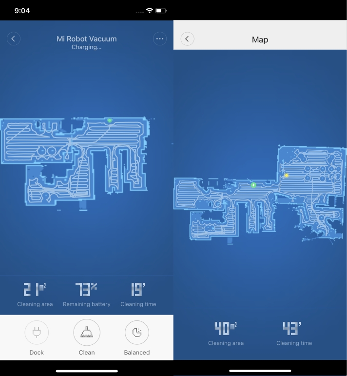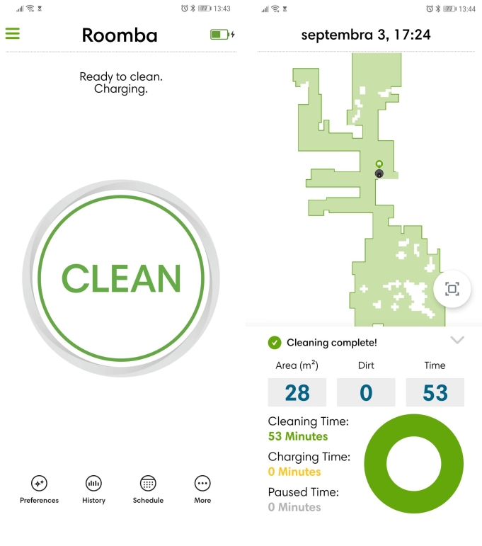 Mobilná aplikácia tiež umožňuje nastaviť bežné alebo dvojité čistenie, prípadne nechať na rozhodnutí robota, ktoré miestnosti koľkokrát vysaje. Dvojité čistenie je vhodné využívať v prípade, že máte doma domáceho maznáčika. Samotná mobilná aplikácia je pomerne jednoduchá, čo je pre mnohých vítané. Prvotné spárovanie vysávača je jednoduché a nestratíte sa ani v nastaveniach. Na rozdiel od Xiaomi, iRobot aplikácia slúži iba na ovládanie vysávača.
