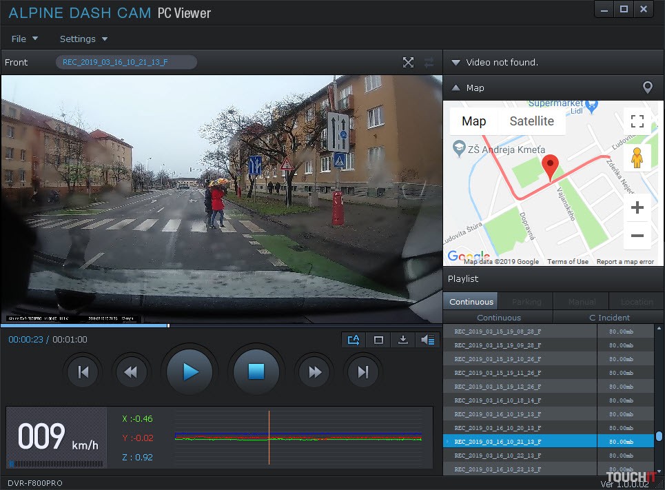 K dispozícii je aj voliteľná kamera (RVC-R800) na sledovanie diania za vozidlom. Tú potom umiestnite na zadné sklo vo vozidle. Pomocou smartfónu ale aj počítača (Windows či Mac) je možné prezerať a upravovať nahrávky. Pre Windows je to aplikácia DashCam Viewer a tá vám prehľadne zobrazí obraz, vašu polohu na mape a rýchlosť. Je to veľmi prehľadné a rýchle. Na počítači pritom vidíte viac ako na smartfóne.