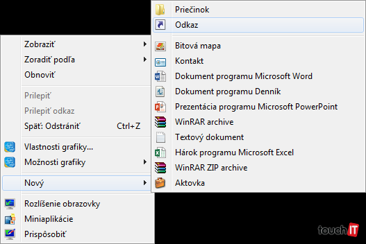 - Vytvorte nový Odkaz – kontextová ponuka na Ploche, v Prieskumníkovi kdekoľvek v adresári – Nový – Odkaz.
