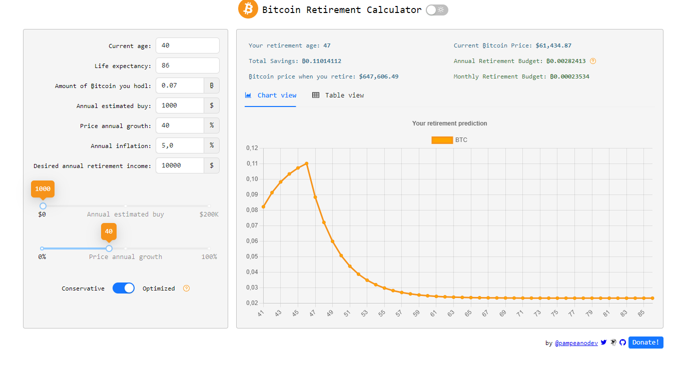 Ide o matematický prepočet, na ktorý sa určite nedá spoliehať. Prináša ale matematické kalkulácie na základne množstva BTC, vašich investícií a predpokladaného úročenia. Niečo, čo by ste si zrejme vytvárali v Exceli sami a tu sa dá s hodnotami celkom dobre pracovať. Bitcoin Retirement Calculator je šikovný pomocník, ktorý vás môže motivovať k šetreniu.