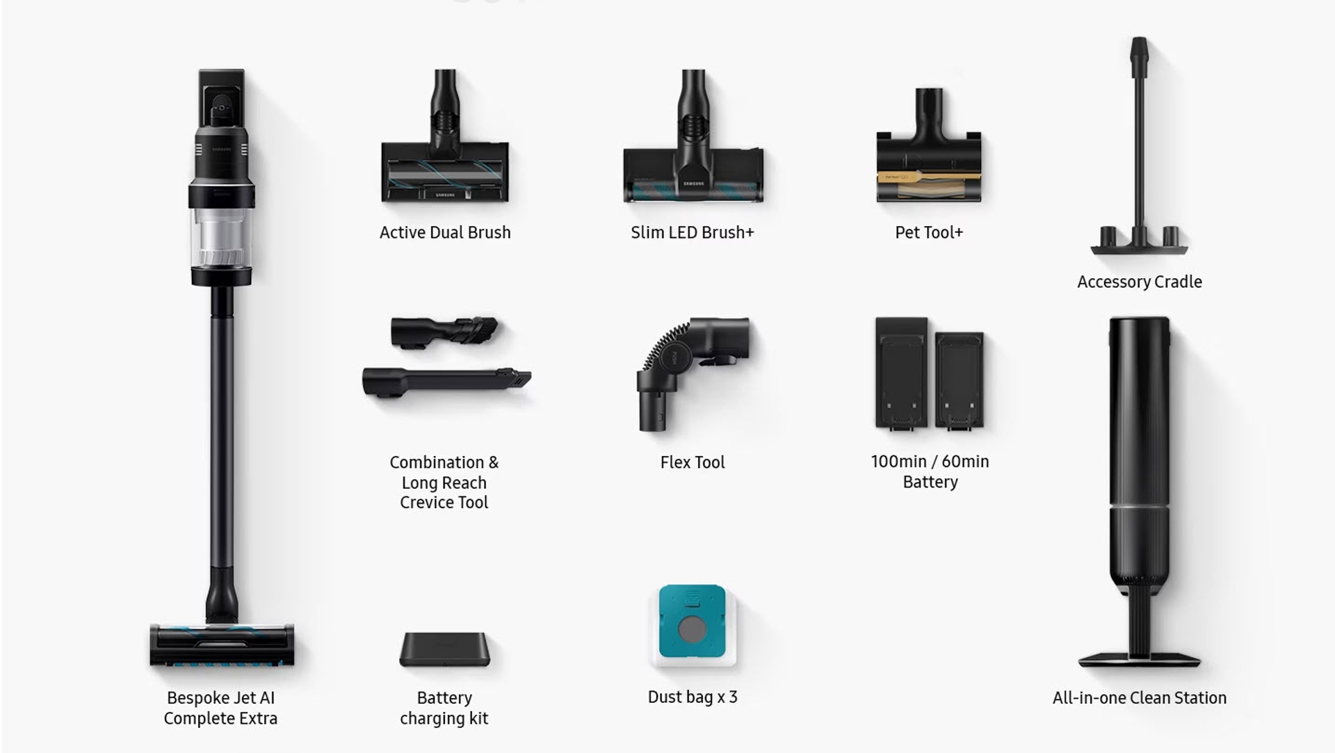 Samsung zatiaľ nevyrobil silnejší tyčový vysávač ako práve Bespoke Jet AI, jeho výkon je až 280 W. Viacnásobná filtrácia vzduchu zachytí aj jemný prach a dodávaná batéria zvládne čas prevádzky až do 100 minút na jedno nabitie. Nabíjanie akumulátora trvá asi 5 hodín a po 500 nabíjacích cykloch si batérie zachová 70 % pôvodnej kapacity. Súčasťou dodávky boli dve batérie s rôznou dobou výdrže, kapacita väčšej batérie je 4500 mAh. Menšia batéria je určená na prípady, kedy chcete mať vysávať v ruke a mal by byť čo najľahší.