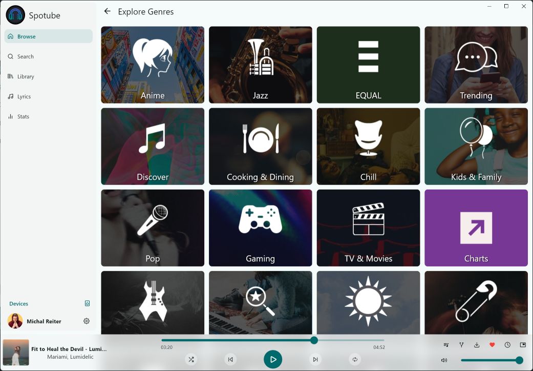 Názov Spotube je charakteristický a rozhranie vyzerá prakticky. Dlaždicové usporiadanie žánrov a najmä rýchlejšie a menej zaťažujúce rozhranie poteší. Hlavná aplikácia pre Spotify je systémovo náročná a najmä všetko sa doťahuje z webu, teda aj reakcie sú pomalšie. Aplikácia je dostupná pre Windows, Linux, macOS, iOS a Android.