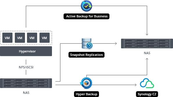 Synology má technológie aj pre takéto firemné zálohovanie, zálohovať sa dá na diaľku a samozrejme do viacerých cieľov. Využijete pritom službu Hyper Backup.