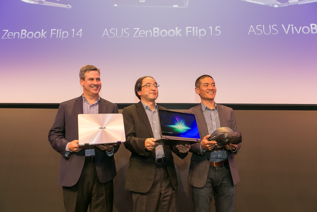 Toto sú hlavní hrdinovia tlačovky ASUS – ZenBook Flip 15, VivoBook Flip 15 a Windows Mixed Reality Headset.