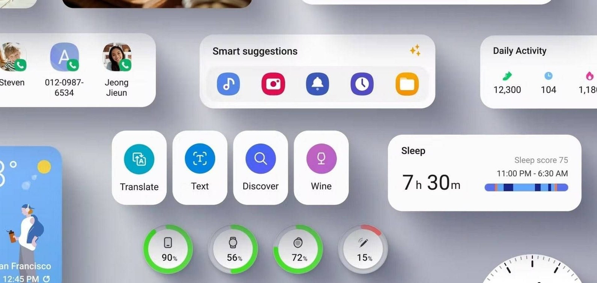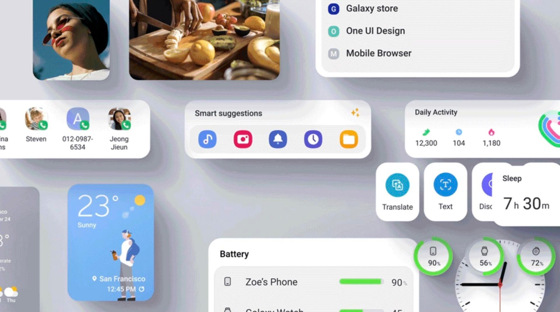 Samsung vylepšil prácu s aplikačnými oknami a prepracoval hornú lištu, ktorá sa vysúva v dvoch krokoch. Najprv pre notifikácie s kompaktnou podobou skratiek rýchleho spustenia, potom v komplexnejšej podobe cez celý displej. Do systému pribudli pokročilé úpravy uzamykacej obrazovky, ktorá sa mohla spolu s tapetou meniť pri aktivácii konkrétneho, napríklad pracovného, režimu. Došlo aj k prepracovaniu fotoaplikácie, ktorá sa naučila automaticky skenovať dokumenty. Pri požadovaných fotografiách potom AI odporúčala vhodné úpravy a editácie. Vizuálnou obmenou prešla aj väčšina systémových aplikácií.