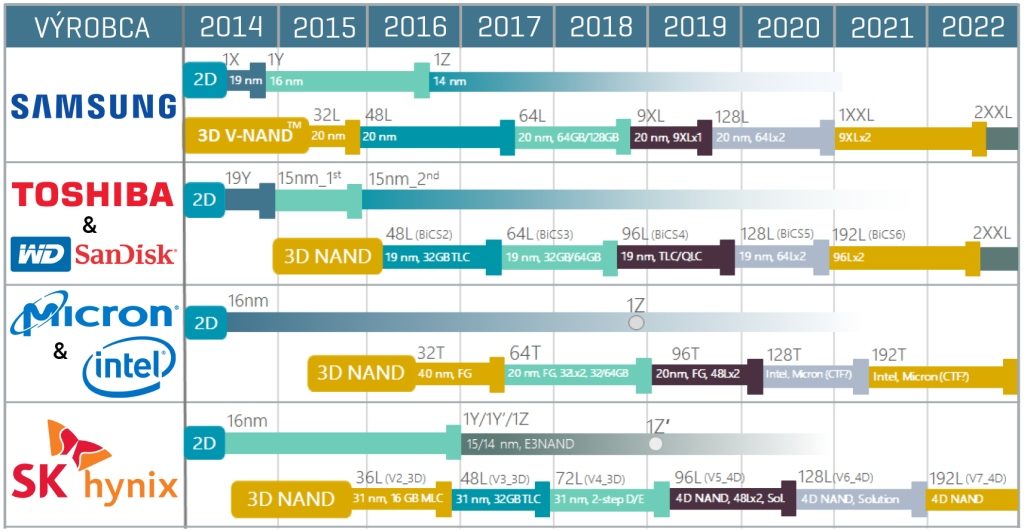 Z tohto dôvodu ešte pred pár rokmi hrozil seriózny koniec pokroku a vývoja NAND flash. Výrobcovia však urobili famózny a nesmierne komplikovaný krok, pri ktorom začali byť schopní litograficky vyrábať komplexné vertikálne konštrukcie. A preteky pokračujú.