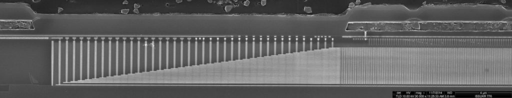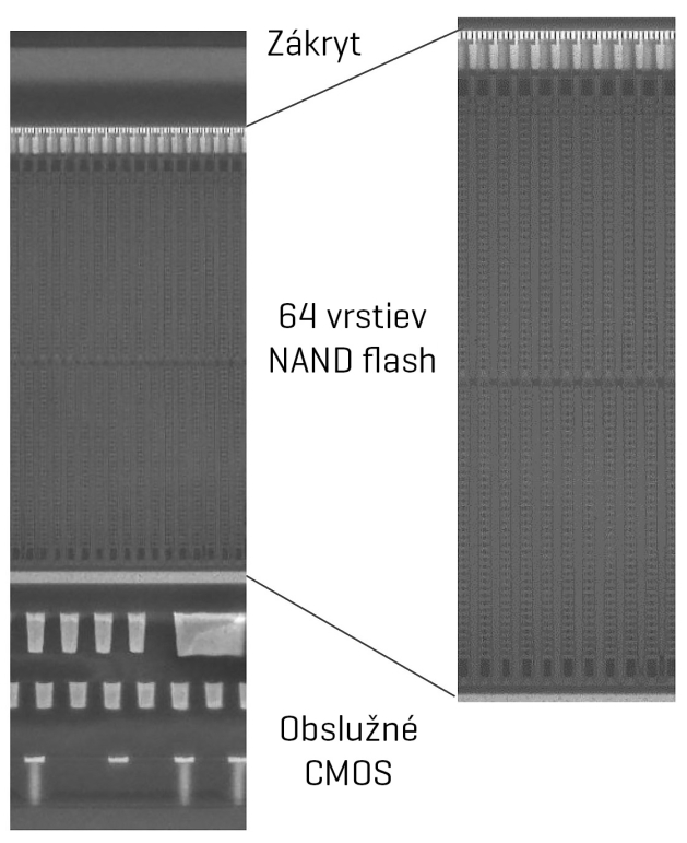 Rez súčasným 64-vrstvovým NAND flash čipom firiem Micron a Intel. V strede si všimnite miesto, kde bola konštrukcia „mrakodrapu“ pri výrobe nadviazaná