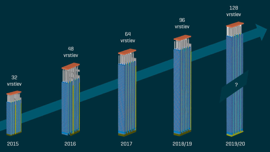 V rokoch 2015 a 2016 sa nám pri tom podarilo stavať na seba 32- až 48-tranzistorovú radu (na grafe môžete vidieť, kedy tieto metódy jednotlivé firmy začali zvládať), čím sme na 19 nm dosiahli hustoty, ktoré by na plocho zvládol až 3 či 2 nm výrobný proces. Výrobcovia pritom 19 nm výrobný proces budú používať dlhodobo aj naďalej, pretože ide o stabilnú veľkosť pre tranzistory v TLC a QLC podobách. Hon na malosť skrátka nahradil hon na výšku.