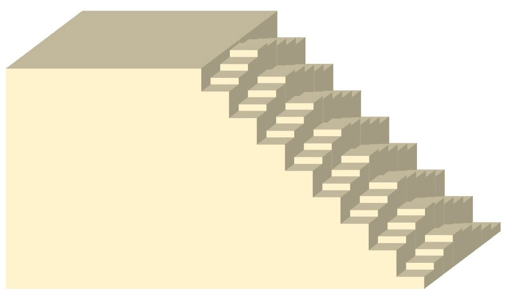 Jednou z preskúmavaných možností, ako tento problém riešiť, je sekať schodisko v dvoch rozmeroch. To ako to vyzerá, môžete vidieť na schematickom obrázku vyššie. Všimnite si, ako jeden schod oddeľuje až osem poschodí, pričom tie sa následne sprístupnia štvorstupňovým schodišťom do priečneho smeru z oboch strán. Každý priečny stupienok obsahuje dve vrstvy, pričom v jednom smere sa odhalí tá vrchná a v druhom smere hlbším odleptaním/vypálením tá spodná. Mohlo by tak dôjsť k zmenšeniu nárokov na cenný horizontálny priestor.