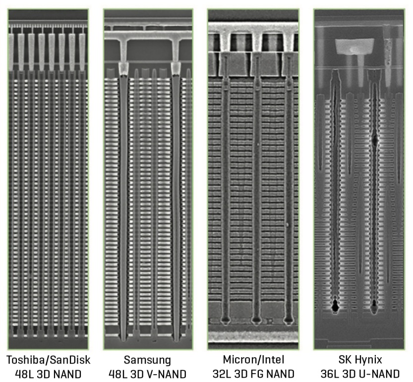Je pritom dôležité upozorniť, že štruktúry a proces výroby jednotlivých výrobcov sa vzájomne v mnohom líšia. Ide o vrcholový vývoj, ktorí si dvaja samotári (Samsung, SK Hynix) a dva kooperujúce páry (Intel/Micron a Toshiba/SanDisk) strážia. Súčasné 64/72-vrstvové čipy NAND flash, ktoré behom roku 2018 kraľovali trhu permanentných polovodičových úložísk, sú už mimoriadne komplexná záležitosť. Vytvoriť takéto konštrukcie nie je ľahká úloha, pričom na obrázkoch môžete vidieť, že „64-poschodový“ mrakodrap je vytváraný v pároch, kde okrem 64 vrstiev tranzistorov je nutné vytvoriť aj niekoľko ďalších prvkov a vrstiev na ich ovládanie.