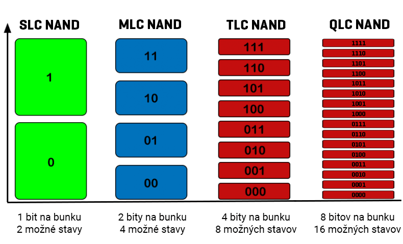 Daný postup sa začal ťahať ešte ďalej a výrobcovia začali používať aj trojúrovňové riešenie (označované aj ako TLC), ktoré je v súčasnosti štandardom a štvorúrovňové riešenie (QLC), ktorého výraznejší nástup môžeme čakať v priebehu tohto roku. Marketingové označenia TLC (Triple-Level Cell) a QLC (Quad-Level Cell) sú trochu mätúce, pretože v skutočnosti je znásobovanie binárne a „trojúrovňové bunky“ teda majú 8 možných úrovní/stavov a „štvorúrovňové“ až 16 stavov.