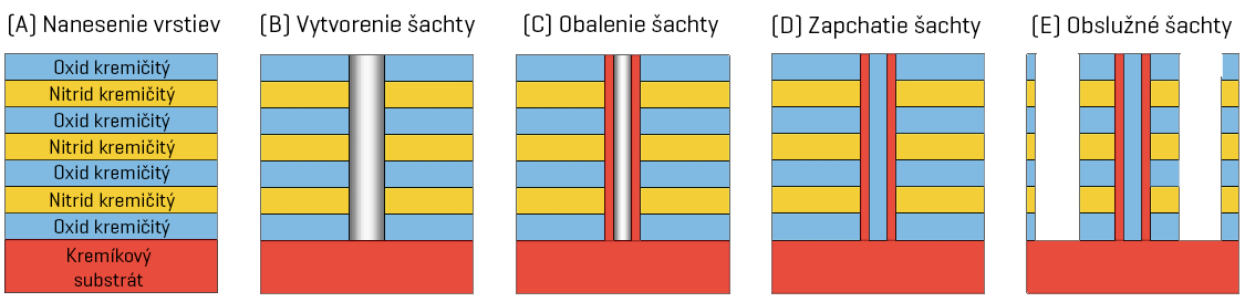 V rámci 3D NAND v základe začíname nanášaním chemických vrstiev na kremíkový wafer (pre vizualizáciu sledujte obrázok pozostávajúci z jednotlivých krokov), pričom v prípade procesu Samsungu sa striedajú vrstvy nitridu kremičitého a oxidu kremičitého (krok A). Počet týchto vrstiev určí počet budúcich tranzistorov v stĺpci. Po dokončení všetkých vrstiev sa do materiálu vypália šachty (krok B), ktorých steny sa obalia polykryštalickým kremíkom (krok C).