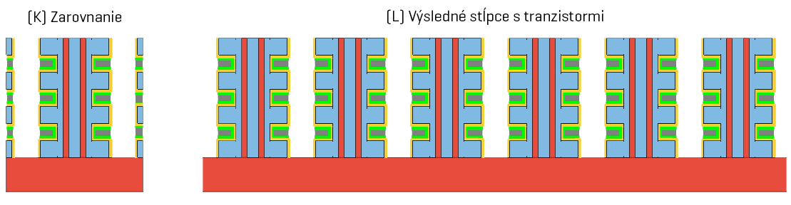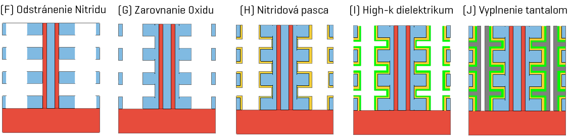 Šachta sa následne leptaním vyčistí od prebytočného materiálu tantalu a dielektrika (krok K), čím sa dokončí stĺpec NAND flash zložený zo zvislých tranzistorov. Každý z nich je pritom tvorený riadiacim hradlom (šedá farba), izolátorom (zelená), nábojovou pascou (žltá), spodným oxidom kremíka na odovzdávanie elektrónov (modrá) a nosným kryštalickým kremíkom (červená).