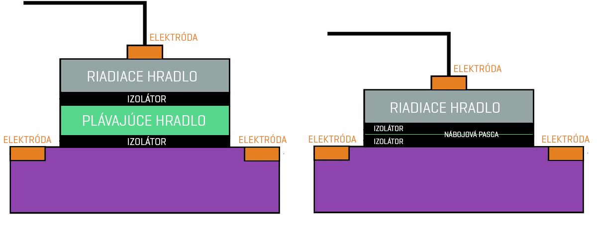 Schéma NAND flash tranzistora s klasickým plávajúcim hradlom a jeho dnes čoraz častejšie používaný variant s nábojovou pascou