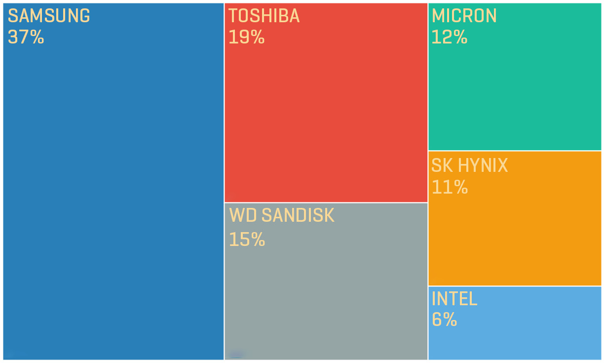 Výrobu NAND flash čipov na vrcholovej úrovni v súčasnosti zvláda už len šesť výrobcov, pričom štyria z nich dokonca vytvorili z dôvodu komplexnosti vývoja a výroby dva kooperujúce páry. V základe teda rozpoznávame len štyri rôzne vývojové prístupy. Najsilnejšiu pozíciu má v tejto oblasti už dlhodobo juhokórejský Samsung, ktorému patrí 37 % trhu, pričom prvé husle pri výrobe NAND flash hrá už viac ako jednu dekádu. Svoje NAND flash konštrukcie si vyvíja a takisto vyrába sám.