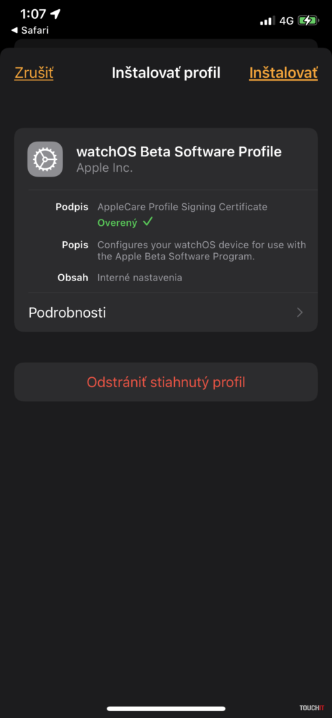 Základom je prehliadač Safari v iPhone, ktorý je spárovaný s Apple Watch. Do prehliadača zadáte URL: https://beta.apple.com. Na tejto stránke je potrebné prihlásenie sa do vášho Apple konta, odsúhlasenie postupu a následne si stiahnete inštalačný profil – treba kliknúť na „Enroll your devices“ a na ďalšej stránke – „Download profile“. Sťahovanie sa po odsúhlasení spustí automaticky a profil môžete okamžite nainštalovať (Apple Watch by mali byť pripojené ku nabíjačke a musia byť odomknuté). Hodinky sa po inštalácii profilu reštartujú.