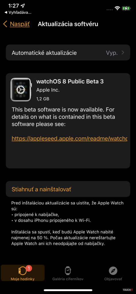 Následne prejdite do aplikácie Watch – položka všeobecné – aktualizácia softvéru. Tu nájdete nový softvér, ktorý stiahnete a nainštalujete ako klasickú aktualizáciu. Súbor má viac ako 5 GB (Apple Watch 5. generácie), takže sťahovať odporúčame až po pripojení na Wi-Fi sieť – inak to v podstate ani nepôjde. Hotovo, stiahnete, nainštalujete a môžete používať nový WatchOS 8 už dnes.
