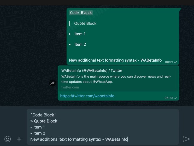 O pripravovaných zmenách informoval aj portál WABetaInfo, ktorý na základe indícií tvrdí, že WhatsApp pripravuje podporu pre formátovanie blokov kódov, blokov citácií a zoznamov s odrážkami. Tieto funkcie boli spozorované v najnovšej beta verzii aplikácie WhatsApp Desktop, avšak je celkom možné, že tieto novinky sa nakoniec dostanú aj do aplikácií pre Android a iOS.