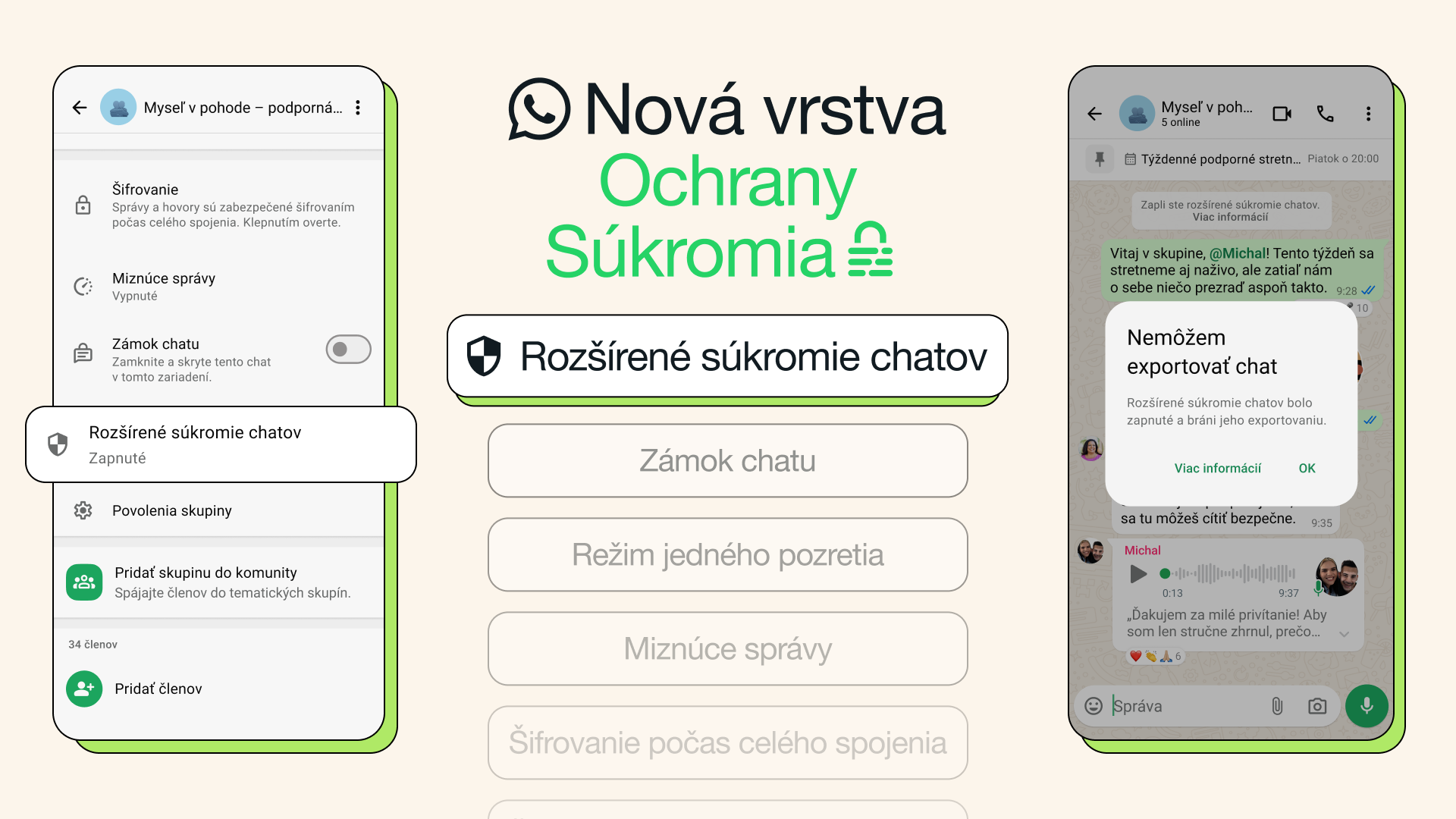 Teda, WhatsApp hovorí, že všetky čety sú súkromné a je to pravda. Teraz ale ide o to, aby si používatelia nemohli tak ľahko robiť screenshoty alebo ukladať médiá z konverzácií. Nová funkcia sa volá Advanced Chat Privacy a mala by byť dostupná. Zatiaľ však nie je, no možno bude s najbližšou aktualizáciou aplikácie. Po slovensky sa bude volať Rozšírené súkromie chatov.